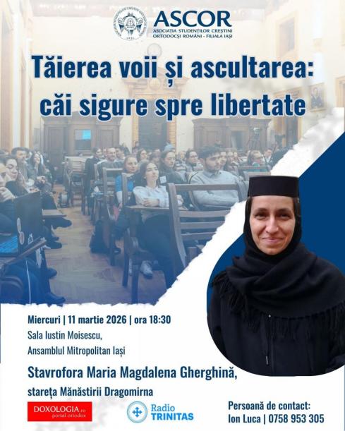 În Sala „Iustin Moisescu” din cadrul Ansamblului Mitropolitan din Iași, între orele 18.30 și 20.30, va avea loc o conferință organizată de ASCOR Iași. Invitată va fi stavrofora Maria Magdalena Gherghină, stareța Mănăstirii Dragomirna, care va susține prezentarea cu tema: „Tăierea voii și ascultarea: căi sigure spre libertate”. Evenimentul se adresează studenților și publicului larg.